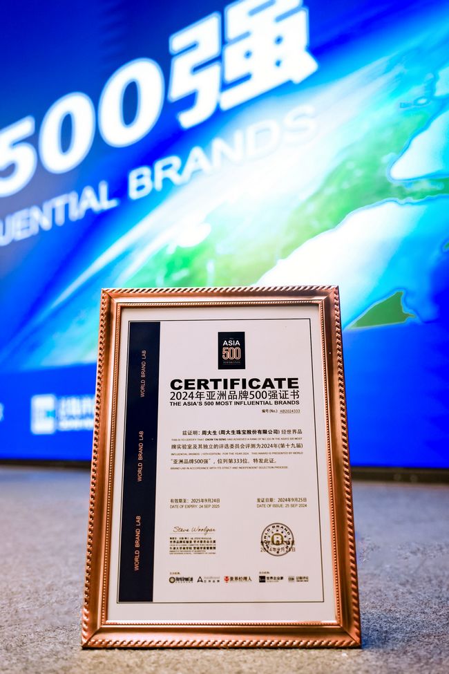 2024年9月25日,由世界品牌实验室主办的“亚洲品牌大会”在中国香港召开。会上发布了2024年(第十九届)《亚洲品牌500强》年度报告,周大生珠宝连续12年荣获“亚洲品牌500强”称号,名列亚洲品牌500强榜单第333位,位居内地珠宝品牌第一,雄踞亚洲珠宝品牌前三,与20个国家和地区的500个超级品牌共同登榜,彰显出强大的品牌实力。