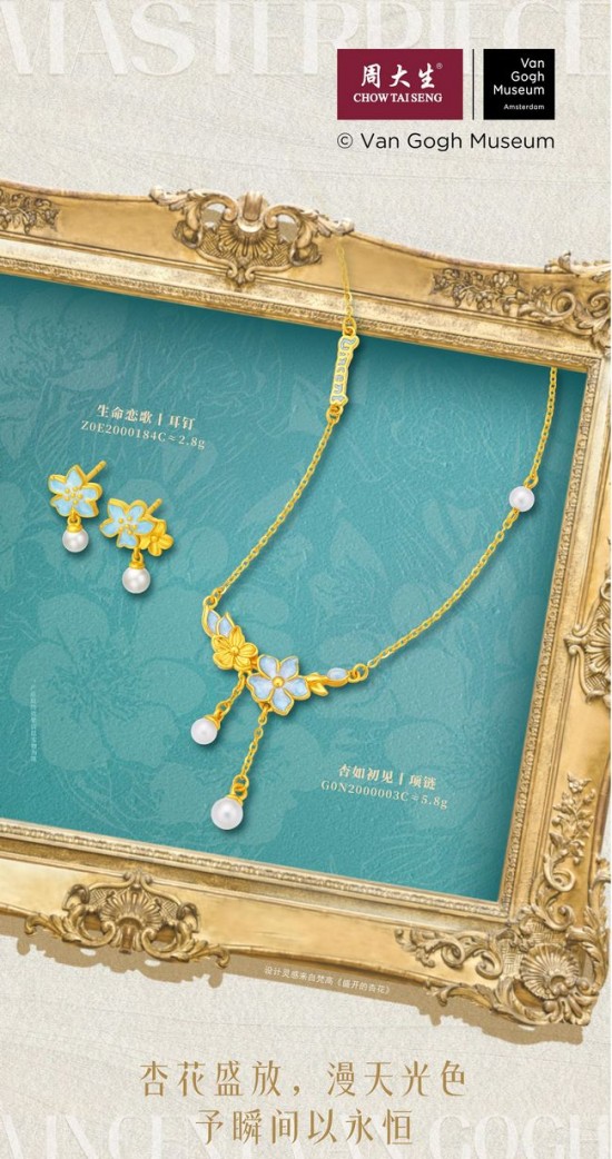 周大生大师艺术珠宝·炽热梵高系列“杏如初见”,设计灵感源自梵高画作《盛开的杏花》中标志性的杏花元素,以简约的线条表达出杏花充满生命力的绽放姿态,温柔而又充满力量,生动诠释了梵高笔下的生机与希望。新的一年,艺起浪漫璀璨。